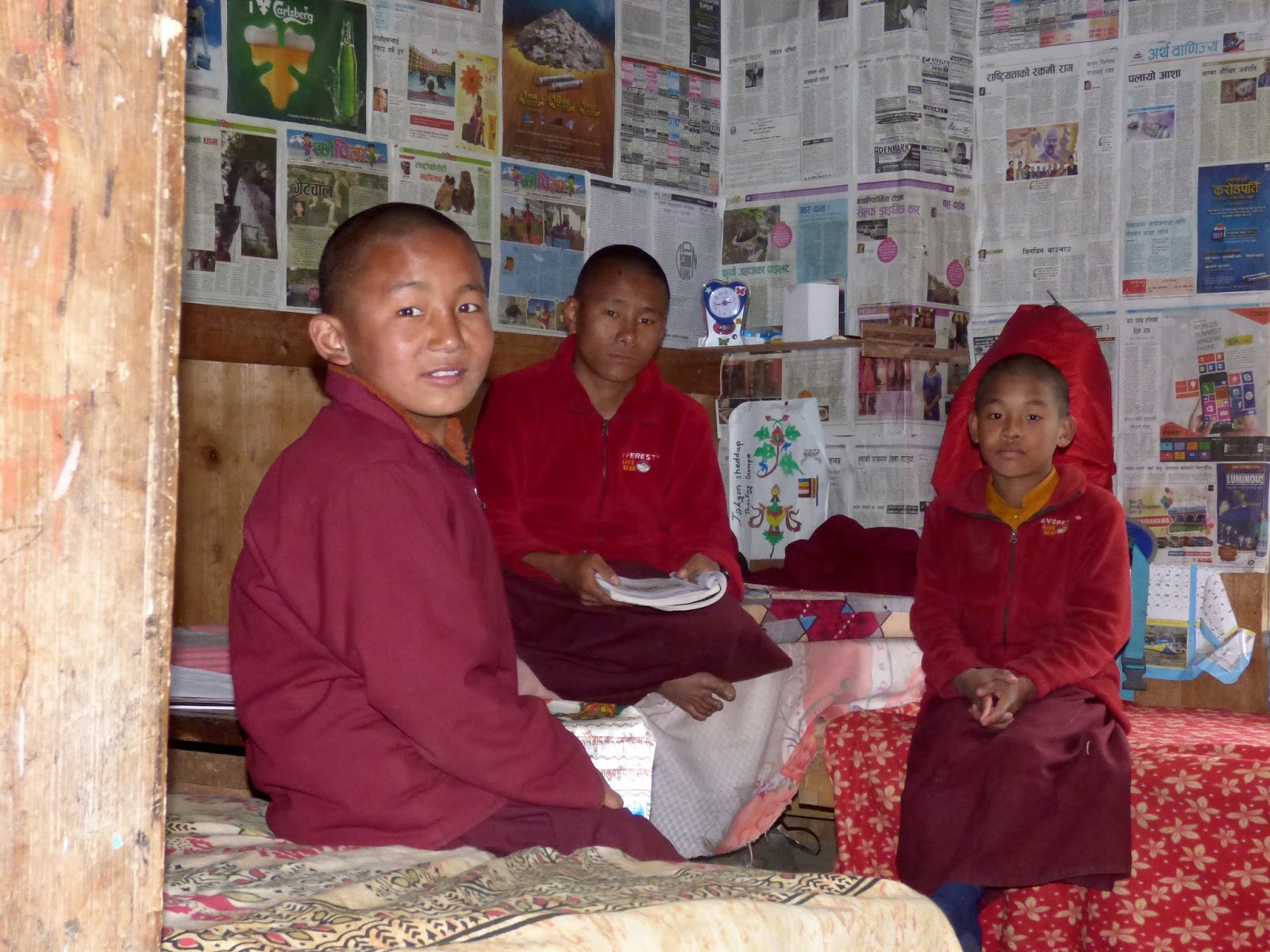 Breakfast and we're off on day two of our trek into Chhulemu. We climb up to a pass, and then down to Taksindu - a small Nepalese village and home to a Buddhist monastery. The monks hold a ceremony for us and we receive the first of many scarves as a gift. We stroll around Taksindu and take in the sights and the clouds break for a moment and we can see higher peaks of the Himalayas briefly. Don Moore announces that it is only a twenty minute hike down to Chhelemu (it takes an hour and a quarter - Don (the head of the non-profit) is a good man, but distance, time and trail steepness descriptions are not his strong suit). We do eventually arrive to Chhelmu and a lovely greeting sign made of flowers. This is to be our home for the next 6 days or so. Donna and I are in the first of 8 tents all in a row on the hillside. The view from our tent is quite dramatic. The tent is roomy and we have a great sleeping pad provided. Toilet facilities are a bit primitive (a hole dug in the ground, with a shelter set around it for privacy), and we have small enclosures with sun showers that later in the week the Sherpas fill with hot water. A large tent for eating, and we are good to go.