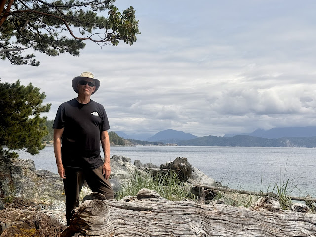 Rain off and on today. I did a 12 mile RT bike combined with a 3.5 mile woods walk on the Siskin trail system near Manson’s Landing, then another 3.5 miles on Hank’s Beach and since it was low tide the beach at Hank’s Beach. Donna got the yummy fresh baked bread at the Co-Op store and went to an art “show” at Hollyhock that was pretty much a bust, but she walked the beach at Hollyhock since it was lower tide as well.